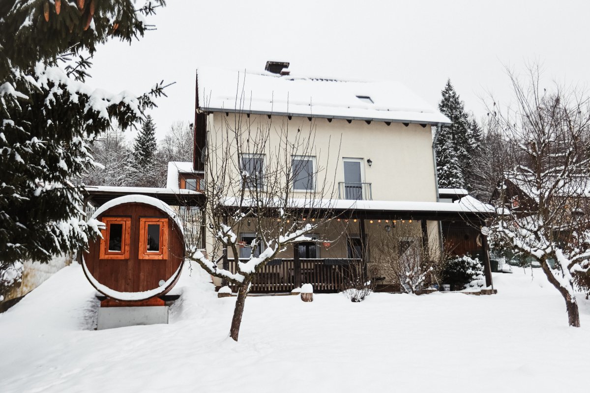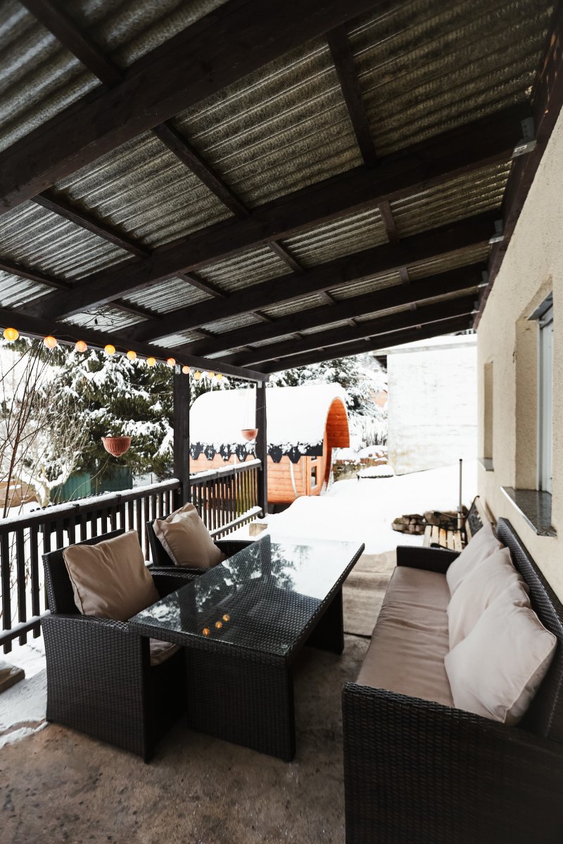Im Keller erwartet Sie ein einladender Partyraum mit direktem Zugang zur großen Terrasse, auf der sich eine Fasssauna befindet. Hier können Sie den beeindruckenden Blick auf das Tal genießen und die Seele baumeln lassen.