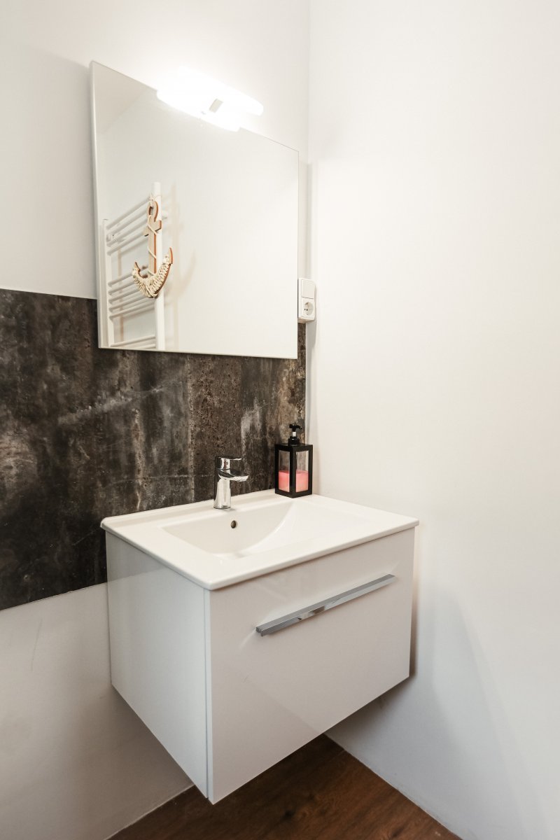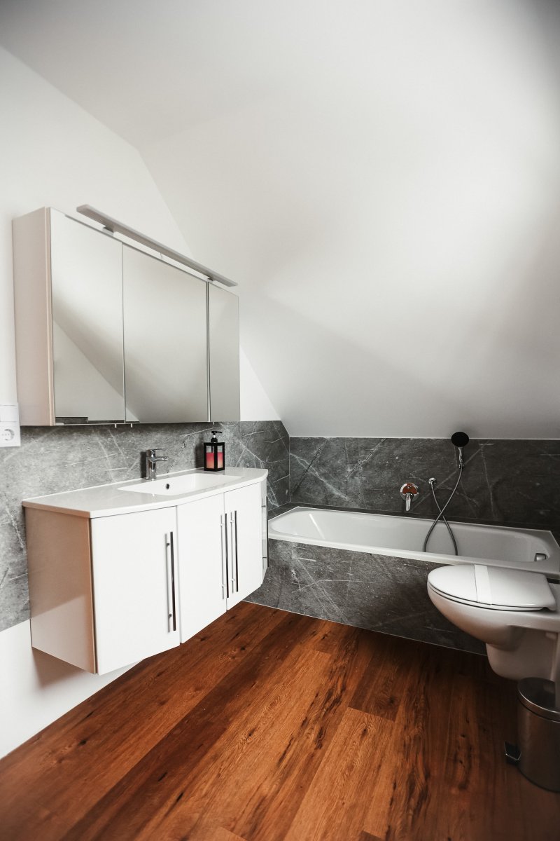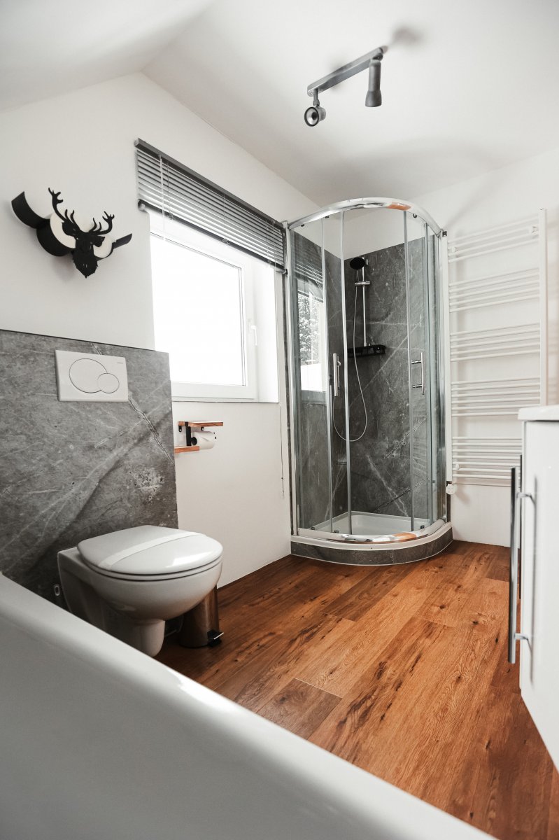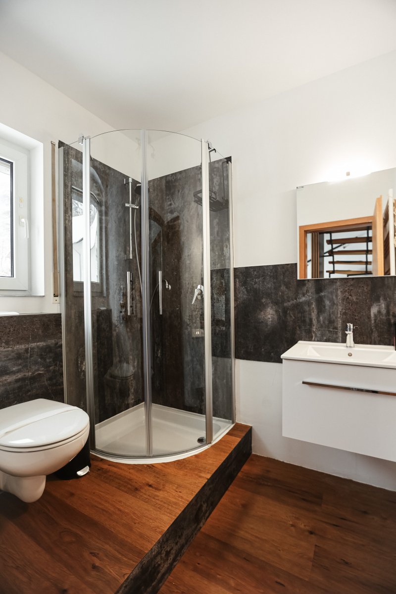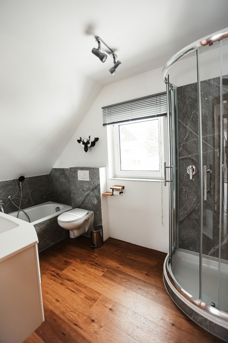 Die beiden Badezimmer sind modern gestaltet und bieten insgesamt zwei Duschen sowie eine Badewanne – ideal für entspannte Momente nach einem aktiven Tag.